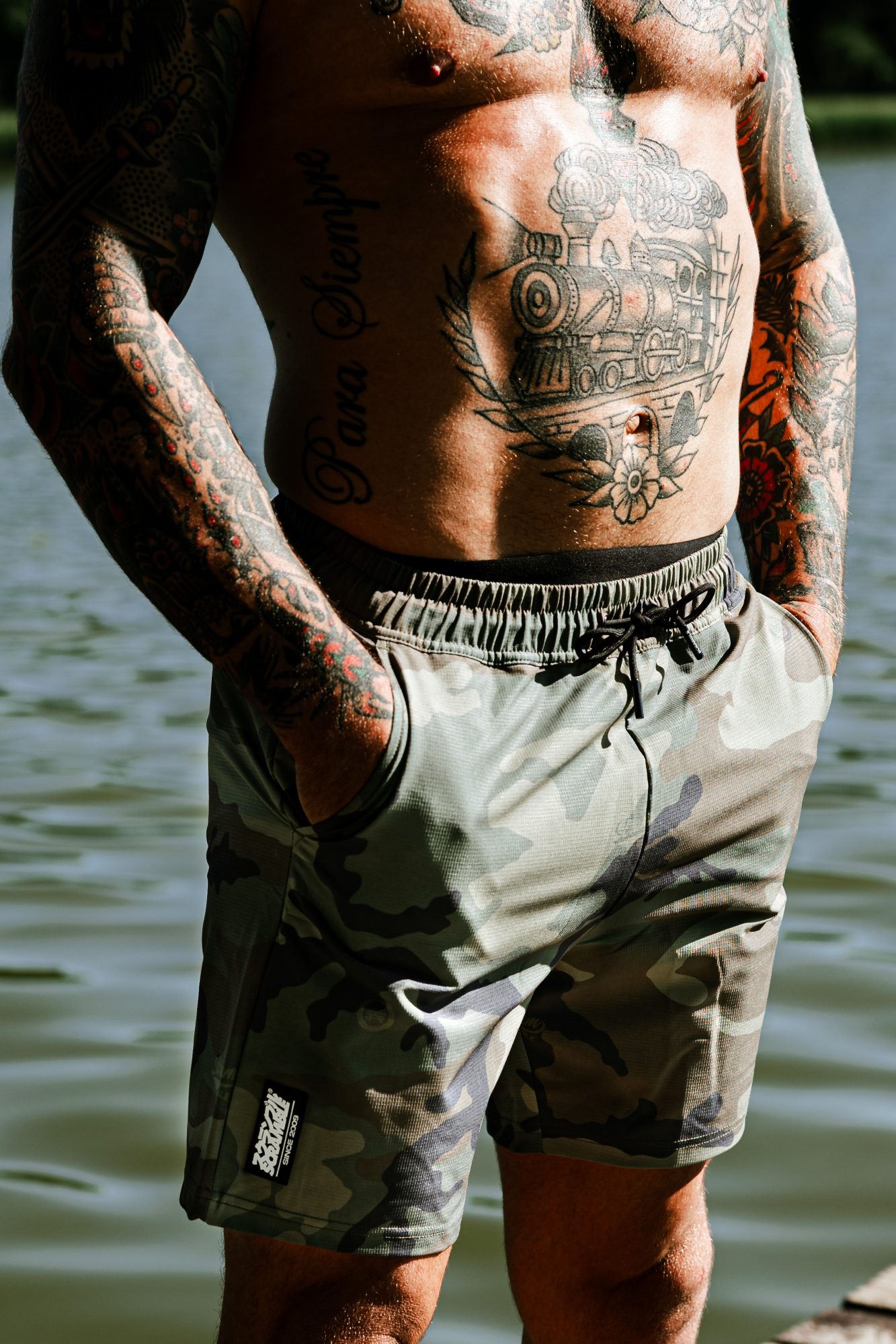 We also have our hybrid training shorts, named Active. The Active shorts are ideal for any kind of sports or exercise, and can be worn casually. These are regular length, straight fitting shorts – with pockets – and drawstring – that are made from durable, quick-drying fabric. Available in both navy blue and our signature woodland camo.