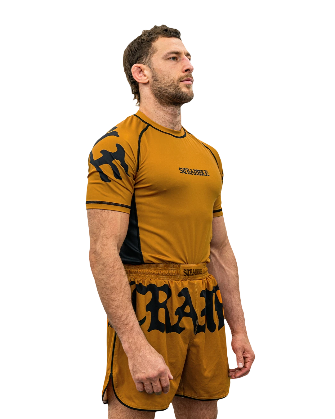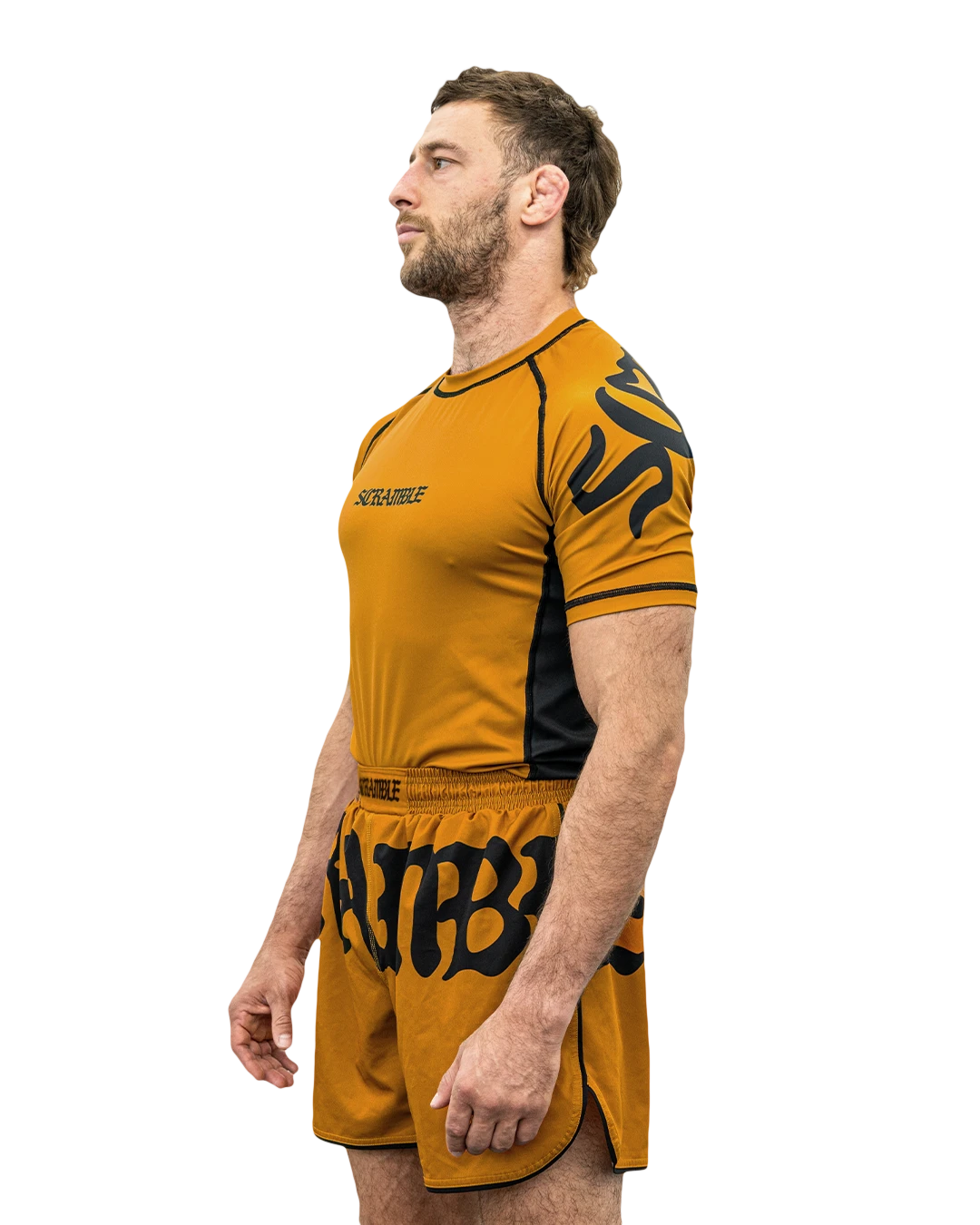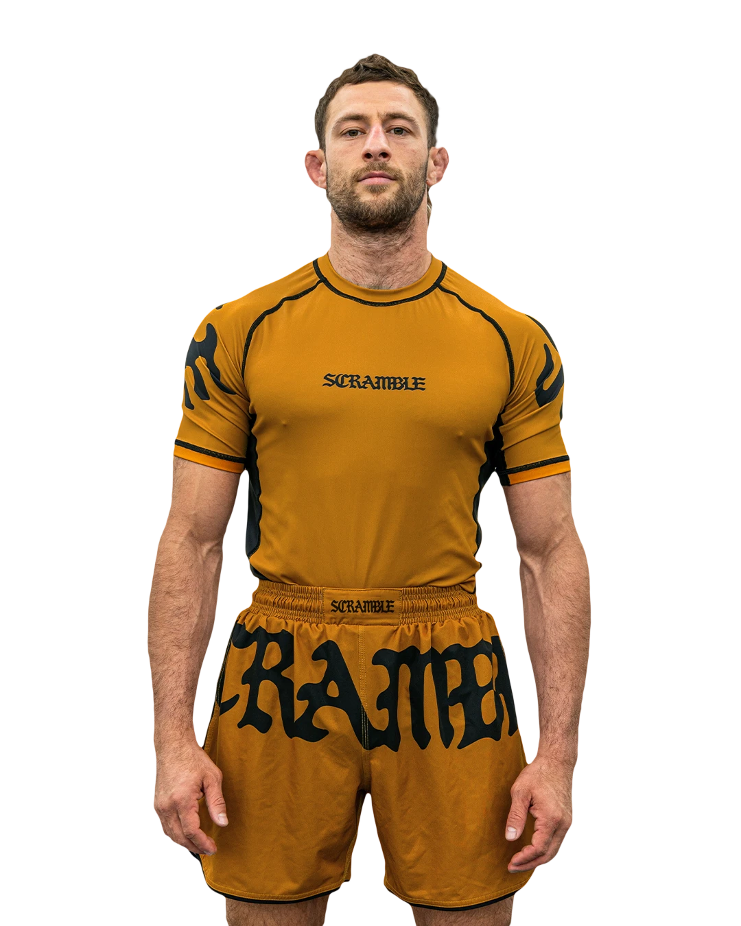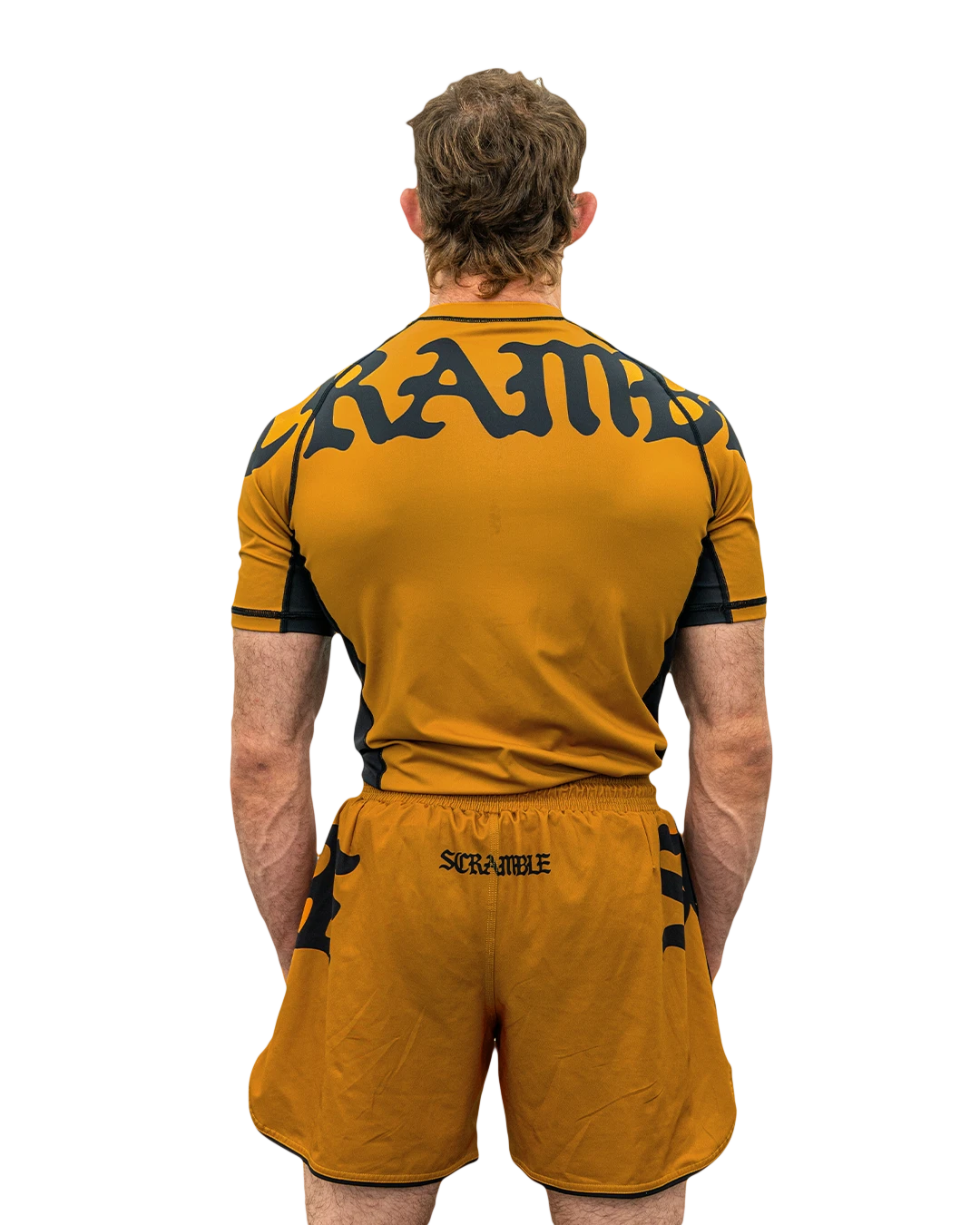 Scramble athlete Ethan Crelinsten (formerly of Craig Jones’ B-Team, now of Simple Man Martial Arts) loved the original black and white Glyph nogi rashguard so much, he asked us to put together a whole set in colours he chose. So, we have the Glyph set – which now includes shorts – in both Olive Green and Burnt Orange colourways. The Glyph set applies a simple gothic graphical theme and Scramble type treatment, which spans multiple panels across the garment, with a complimentary, smaller logo on the reverse side. Limited quantities, no restocks.
