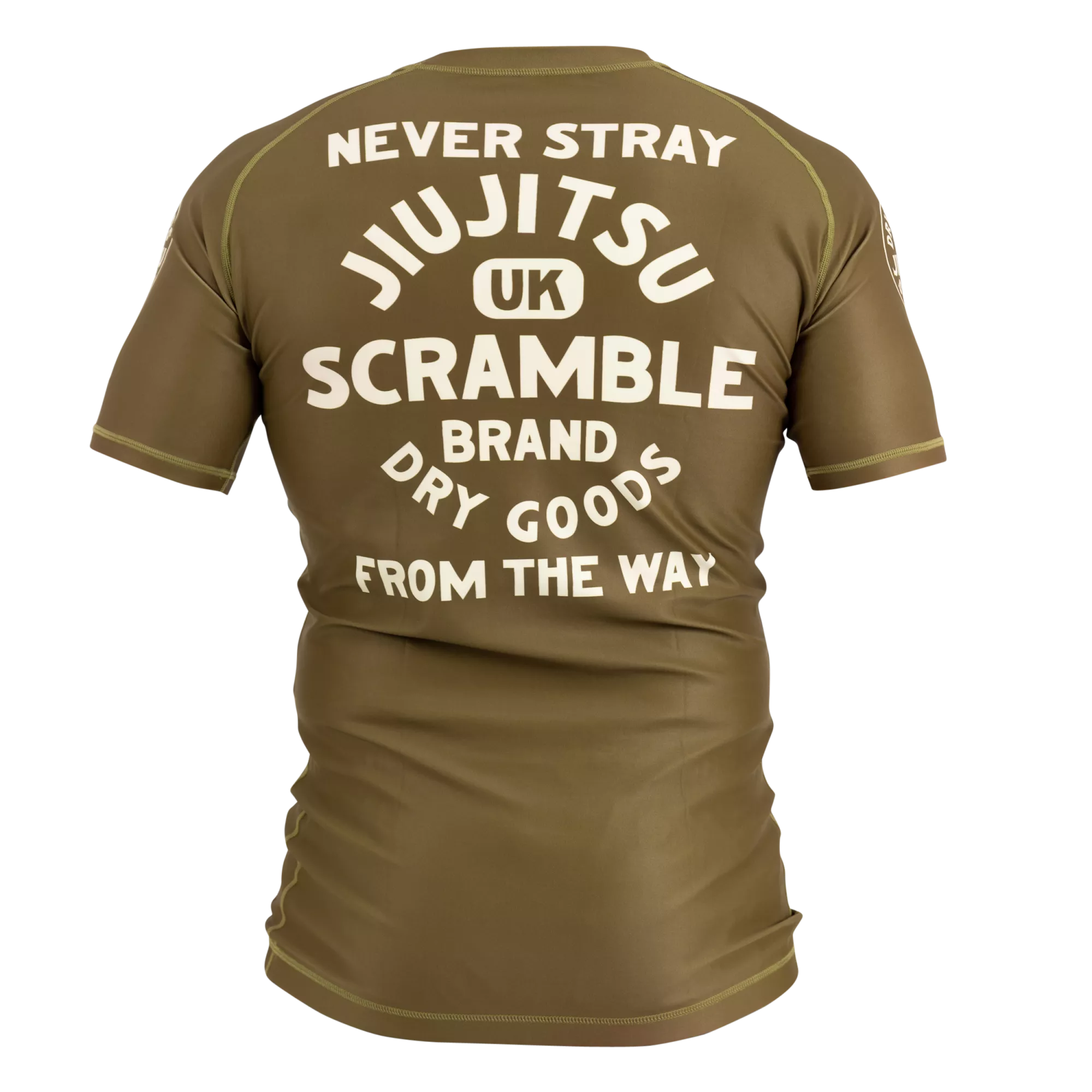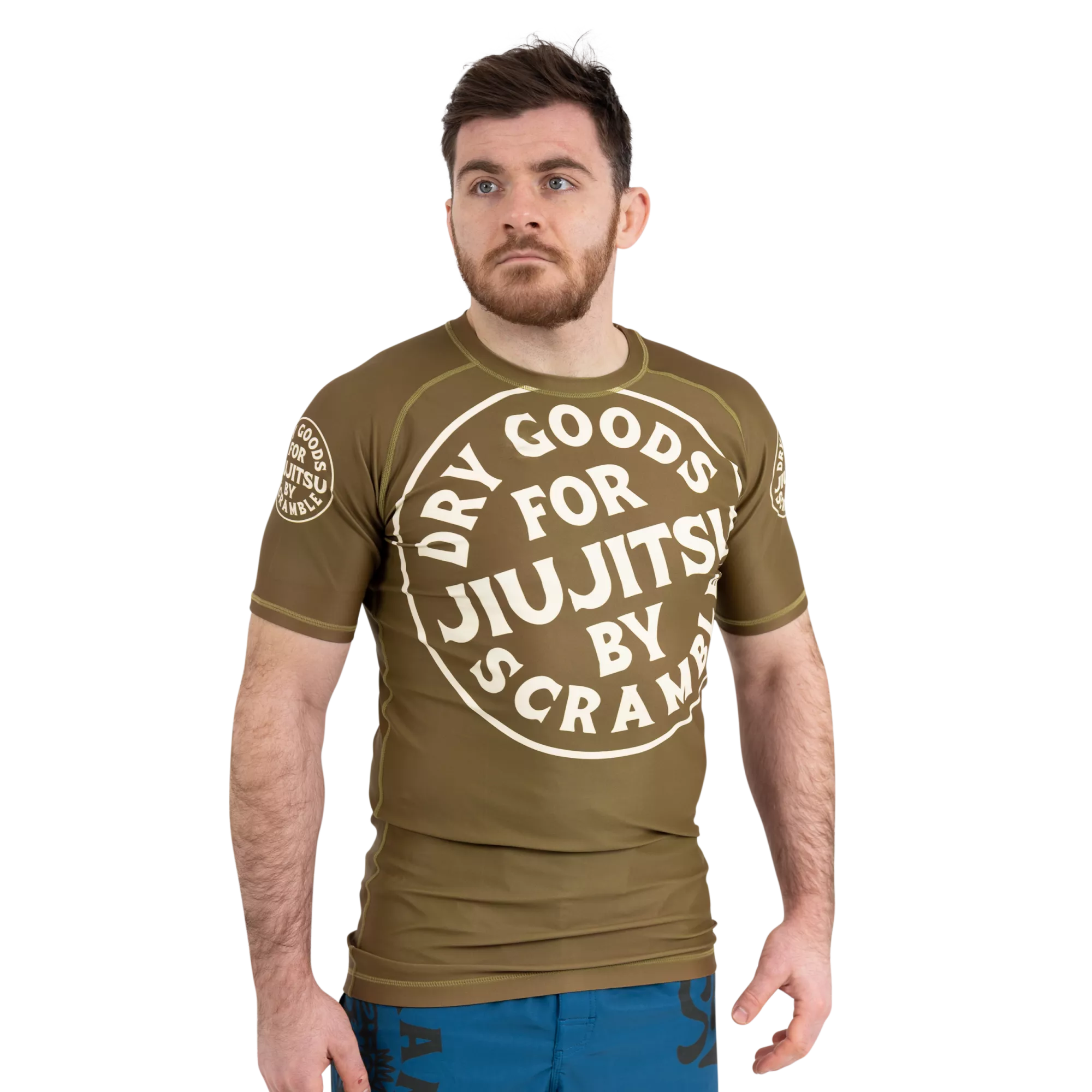 This is our Dry Goods rashguard. It’s a rashguard, with a design on it that I have decided to call Dry Goods. That’s about it really. The design is a fairly vintage feeling and the colours are nice and unusual for a rashguard. There really isn’t a huge amount to say, this is a cool short sleeved rashguard for jiujitsu and grappling that you might like to buy. The quality is tip-top, obvs.